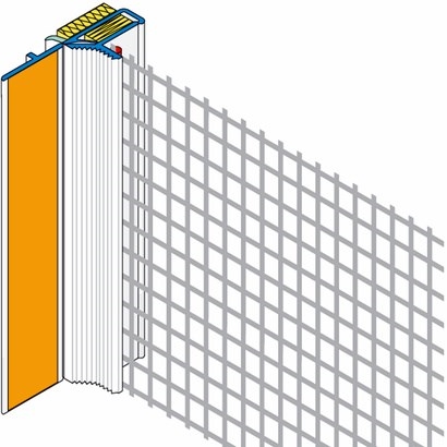 Het pleisteraansluitprofiel voor ramen is erg dun en kan op het raamkozijn worden gekleefd, na de plaatsing van de isolatieplaat. Het raamprofiel is gescheiden door een donkergrijs buisvormig siliconen element en kan daardoor bewegingen in alle richtingen opvangen. Dit zelfklevende profiel wordt op het raamkozijn gekleefd, na de plaatsing van de isolatieplaat en voordat de grondpleister wordt aangebracht.